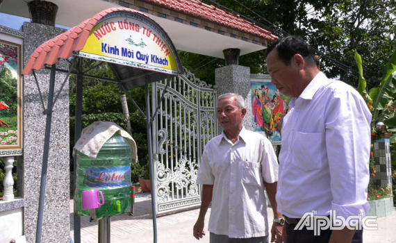 Ông Nghiệp (bìa trái) với bình nước từ thiện trước nhà.