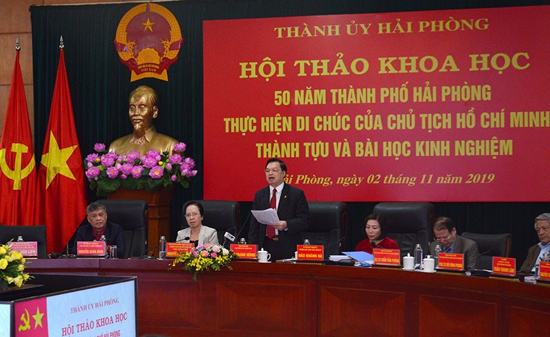 Phát biểu đề dẫn Hội thảo, Trưởng ban Tuyên giáo Thành uỷ Hải Phòng Đào Khánh Hà nêu rõ, Hội thảo khoa học “50 năm thành phố Hải Phòng thực hiện Di chúc của Chủ tịch Hồ Chí Minh – Thành tựu và bài học kinh nghiệm” là dịp để tri ân sâu sắc công lao, cống hiến vĩ đại của Chủ tịch Hồ Chí Minh đối với cách mạng Việt Nam, đồng thời là dịp để nghiên cứu, nhận thức sâu sắc hơn về giá trị lịch sử và ý nghĩa lý luận, vai trò cương lĩnh định hướng của bản Di chúc mà Bác đã để lại cho Đảng và nhân dân ta. Thông qua Hội thảo, chúng ta nhìn nhận, đánh giá về những kết quả đã đạt được, những thành tựu nổi bật, những bài học kinh nghiệm và cả những hạn chế, khuyết điểm cần phải khắc phục, sửa chữa qua chặng đường 50 năm thực hiện lời dạy của Người của Đảng bộ, quân và dân thành phố Hải Phòng. Qua đó, nhằm thực hiện có hiệu quả việc học tập và làm theo tư tưởng, đạo đức, phong cách Hồ Chí Minh; góp phần vào công cuộc xây dựng, chỉnh đốn Đảng, bồi đắp nền tảng đạo đức, văn hoá trong Đảng và toàn xã hội; đẩy mạnh công cuộc xây dựng, chỉnh đốn Đảng, bồi đắp nền tảng đạo đức, văn hóa trong Đảng và toàn xã hội; thực hiện thắng lợi Nghị quyết Đại hội XII của Đảng, Nghị quyết XV Đảng bộ thành phố và Nghị quyết số 45-NQ/TW của Bộ Chính trị khóa XII về xây dựng và phát triển thành phố Hải Phòng đến năm 2030, tầm nhìn đến năm 2045.
