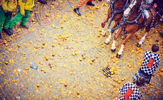 Mỗi năm, vào những ngày trước “Thứ ba béo” (Shrove Tuesday), thị trấn Ivrea của nước Ý biến thành một chiến trường rải đầy cam quýt, nơi những người tham gia phóng 600.000kg cam vào nhau trong lễ hội Carnival lịch sử của thành phố.