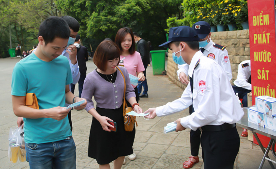 Du khách về hành hương, tham quan được phát khẩu trang miễn phí.