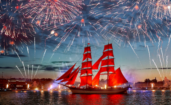 "Cánh buồm đỏ thắm" là lễ hội thường niên được tổ chức vào khoảng từ 18 đến 25/6, khi hiện tượng đêm trắng tại thành phố St. Petersburg rõ nhất. Đây là lễ tốt nghiệp của các học sinh Nga, như một món quà dành tặng các em, đặc biệt là những học sinh có thành tích xuất sắc. Lễ hội đã trở nên nổi tiếng không chỉ trong quy mô nước Nga mà còn thu hút đông đảo du khách nước ngoài mỗi năm.