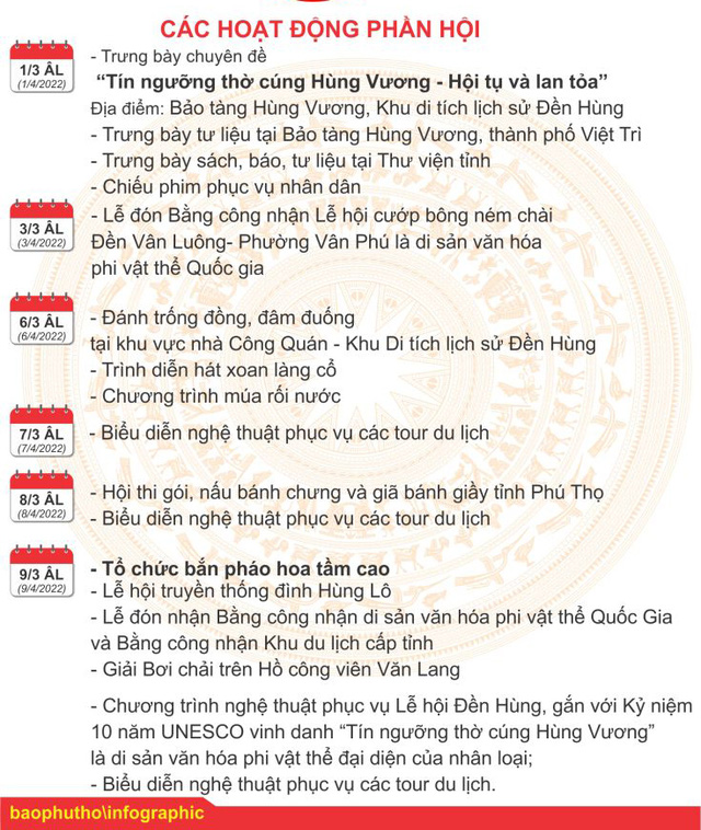 Lễ Giỗ Tổ Hùng Vương năm Nhâm Dần 2022 do UBND tỉnh Phú Thọ tổ chức có chủ đề "Linh thiêng nguồn cội, Đất Tổ Hùng Vương" gắn với kỷ niệm 10 năm UNESCO công nhận "Tín ngưỡng thờ cúng Hùng Vương ở Phú Thọ" là Di sản Văn hóa phi vật thể đại diện của nhân loại.