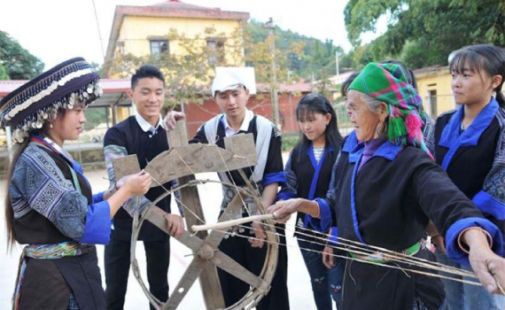 Tái hiện việc xe lanh dệt vải người H’Mông.