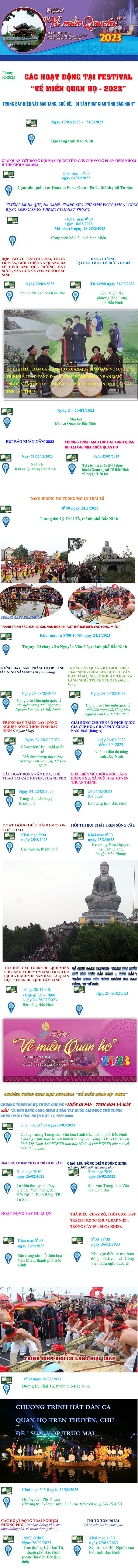 Festival “Về miền Quan họ -2023” với ý nghĩa và thông điệp Kết nối tinh hoa các Di sản Văn hóa phi vật thể được Unesco công nhận được Bắc Ninh tổ chức hoành tráng với các hoạt động làm nổi bật một vùng đất, vùng người Bắc Ninh-Kinh Bắc; nơi thế núi hình sông bồi đắp cốt cách con người trọng nghĩa, vẹn tình, hiếu học, khao khát vươn lên, tỏa sáng. Bên dòng sông Đuống, sông Cầu đầy ắp phù sa đắp bồi những tinh hoa văn hóa tạo vùng lõi cho giá trị văn hóa vùng châu thổ sông Hồng; mái đình thâm nghiêm, trầm mặc lắng đọng da diết những đêm hội làng, sông quê, tình quê...ôm ấp dáng dấp hình hài tạo nên một không gian Kinh Bắc vời vợi, ăm ắp, phên dậu phía Bắc của kinh thành Thăng Long-Đông Đô-Hà Nội, tất cả được hội tụ trong Festival “Về miền Quan họ -2023”.