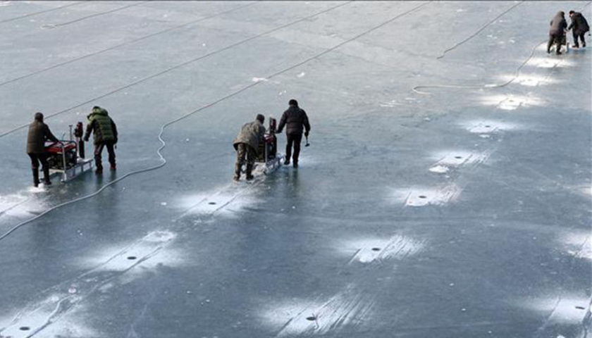 Công nhân đục lỗ câu cá trên sông băng chuẩn bị cho lễ hội Sancheoneo Hwacheon, Hàn Quốc.
