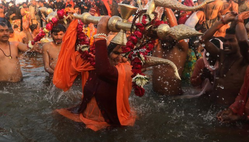 Các naga sadhus hay "người thánh" thực hiện nghi lễ tắm rửa trong Shahi Snan (lễ tắm thiêng) tại lễ hội Kumbh Mela nửa kỳ năm 2019 ở Prayagraj. Ảnh: India Today