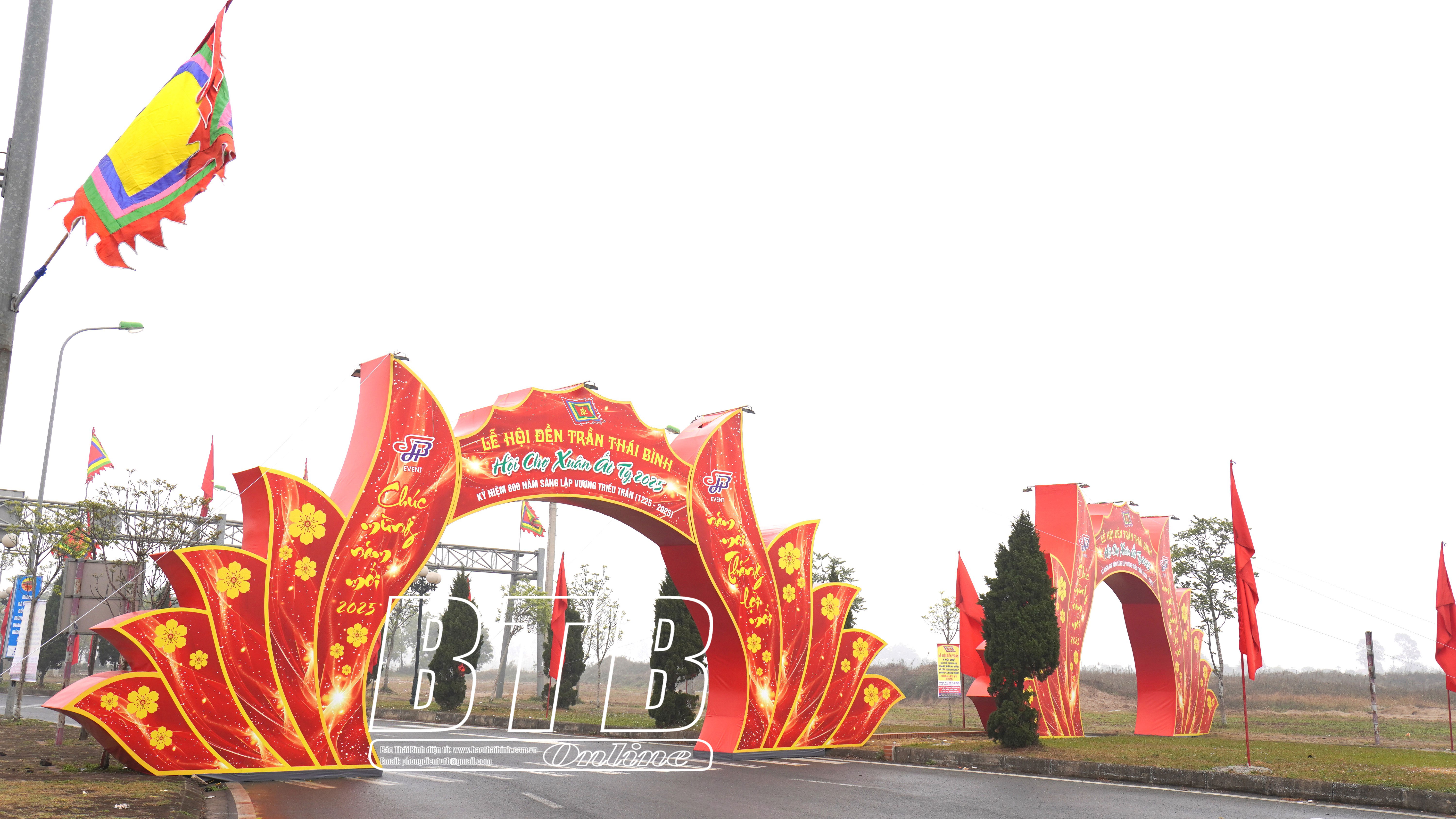Cổng chào rực rỡ trên tuyến đường dẫn vào di tích quốc gia đặc biệt khu lăng mộ và đền thờ các vị vua triều Trần.