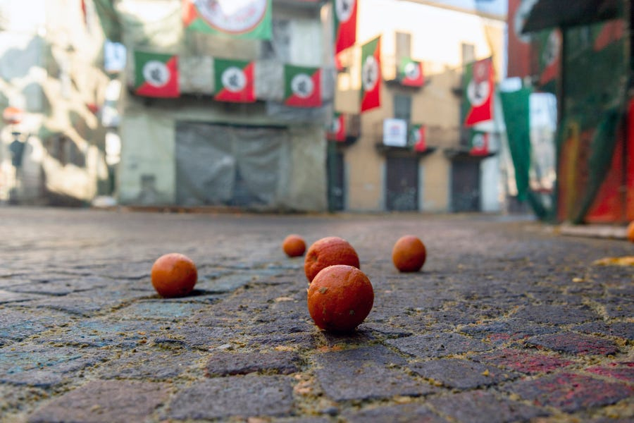 Trước khi bị hủy bỏ, khoảng 15.000 người tham gia hoạt động được mệnh danh là cuộc chiến thực phẩm lớn nhất ở châu Âu này. Trong khi Thị trưởng Ivrea lo sợ sự kiện với hàng nghìn người là vấn đề lớn về sức khỏe cộng đồng, các chiến binh xuất trận trong khí thế hừng hực cùng tinh thần chiến đấu hăng say. Vũ khí của họ là những trái cam chín mọng trên tay.