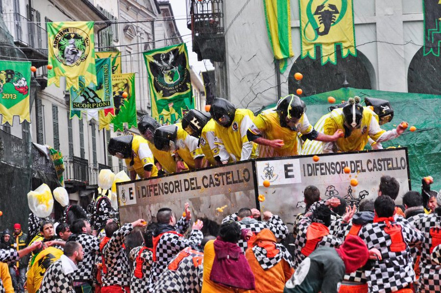 Cuộc chiến ném cam là sự kiện trọng tâm của lễ hội Ivrea Carnival hàng năm, diễn ra tại thị trấn Ivrea ở phía tây bắc Italy. Mỗi năm, thị trấn dự trữ khoảng hàng trăm tấn cam cho các trận chiến. Theo Tổ chức lịch sử Carnival của Ivrea Foundation, lễ hội hàng trăm năm tuổi này là lâu đời nhất ở Italy.