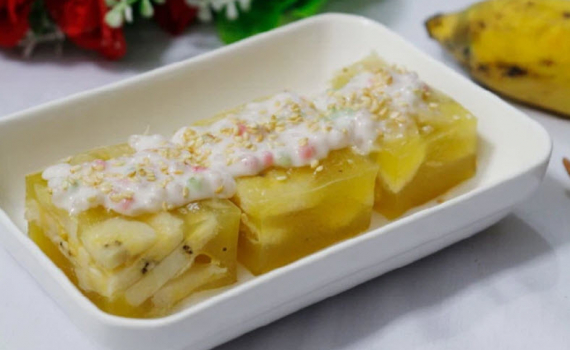 - Bước 1: Chuối lột vỏ, cắt thành từng khoanh mỏng. Cho 2 muỗng canh bột báng vào 150ml nước và ngâm khoảng 10 phút cho bột nở. Tiếp theo, cho vào bát: 120gr bột năng, 40gr đường kính, 1 thìa cà phê muối, 150ml nước vào tô lớn và khuấy đều cho bột tan ra.