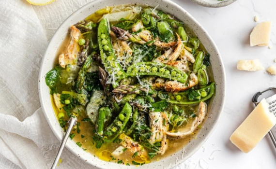 Bước 2: Đổ nước dùng gà vào và đun sôi. Cho thì là, đậu Hà Lan và măng tây vào trước khi giảm nhiệt để đun nhỏ lửa. Nấu trong 10 phút.