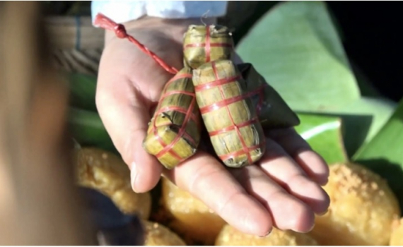 Để làm chiếc bánh này rất công phu từ chọn loại lá nhỏ cho đến làm nếp. Chiếc bánh là tâm huyết của những nghệ nhân mang đến ngày hội không chỉ để trưng bày mà còn cho khách thưởng thức.