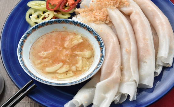 Bánh ướt (Nha Trang) là loại bánh mỏng như tờ giấy, được làm bằng bột gạo và bột năng hoặc tinh bột khoai tây. Theo truyền thống, chúng được hấp trên nồi hấp chuyên dụng và thường được phục vụ ở dạng cuộn. Người ăn thưởng thức bánh ướt cùng với nước mắm, chả lụa, thịt và hành phi. Đây là một món ăn đường phố phổ biến ở Nha Trang. Ảnh: Shutterstock.