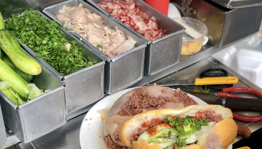 Bánh mì (4,7 sao) được đánh giá là "món ăn phổ biến, quen thuộc và tiện lợi của người dân". Việt Nam có nhiều biến thể bánh mì, tùy thuộc từng tỉnh thành sẽ có các loại nhân khác nhau như pate, trứng rán, giò chả thái lát, xúc xích, ruốc, giăm bông, xá xíu và ăn kèm rau thơm, dưa góp, tương ớt. Thực khách có thể mua món ăn bình dân này ở mọi nơi, từ các hàng quán vỉa hè đến nhà hàng cao cấp. Ảnh: Quỳnh Mai