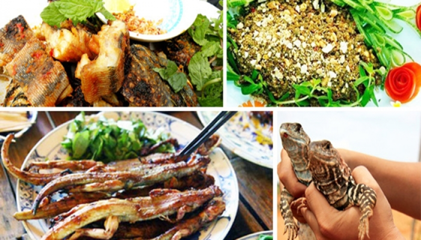 Thịt dông nóng chín vàng hai mặt, săn chắc, khi ăn thì kèm với bánh tráng nước, hoặc ăn với rau sống, bún và bánh tráng cuốn lại, thêm chén nước mắm me chua ngọt cay cay nữa thì ngon hết sảy.