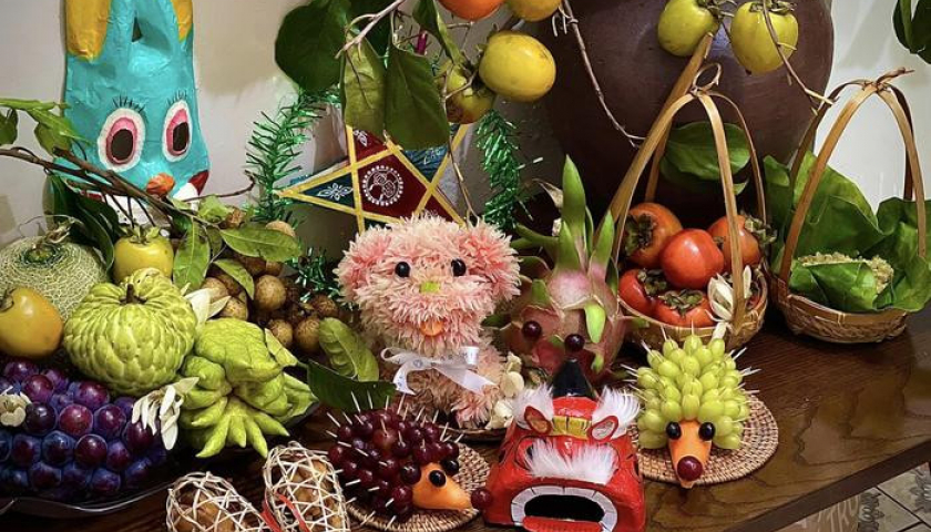 Ngoài chú chó bằng bưởi, có thể bày thêm các loại hoa quả được tỉa khéo léo, bánh Trung thu và các loại hoa…
