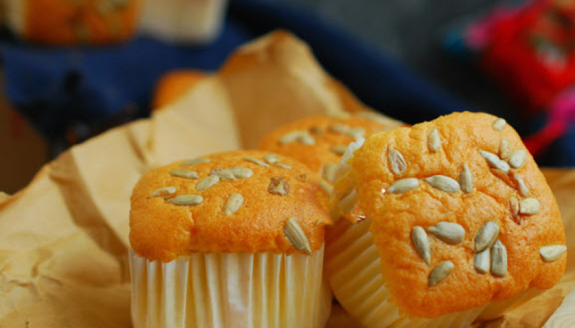 Bước 6: Đặt khuôn bánh cupcake vào khay, sau đó bóp bột vào khuôn. Nếu không dùng chung khuôn với cốc giấy dùng làm bánh cupcake thì bạn có thể tách riêng, dùng khuôn kim loại riêng và cốc giấy riêng. Tuy nhiên, nên dùng theo phương án đầu sẽ giúp định hình dáng bánh tốt hơn và cũng sẽ dễ dàng khi lấy ra hơn. Rắc một lượng hạt bí lên bề mặt bánh, có thể thay thế bằng hạnh nhân, hạt hướng dương, hạt thông tùy theo sở thích.