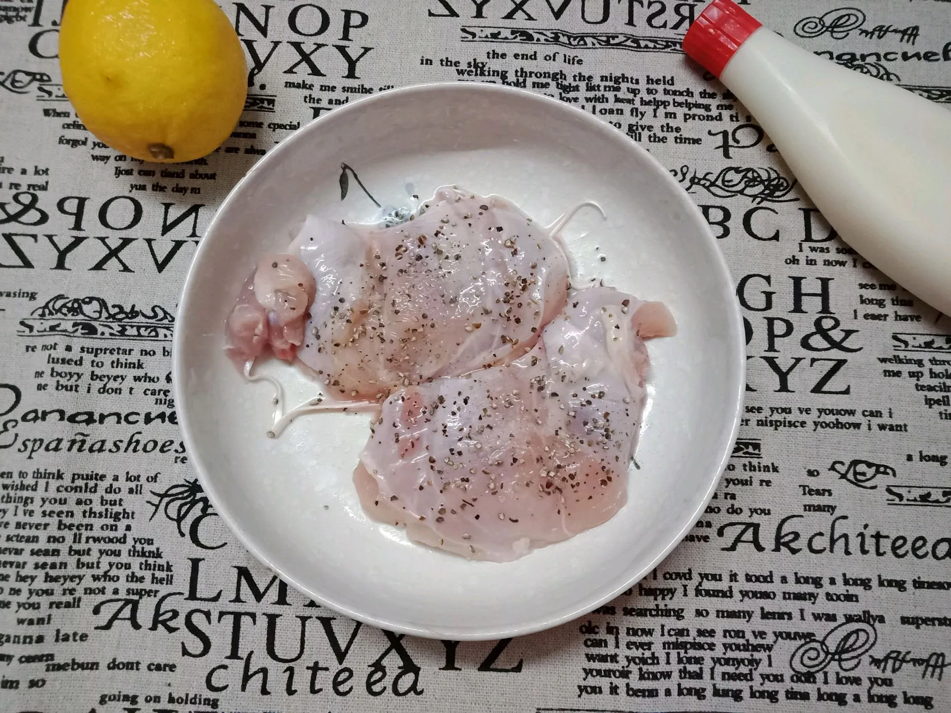 Bước 1: Đùi gà rửa sạch, lọc lấy phần thịt sau đó ướp với chút muối, hạt tiêu trong khoảng 30 phút.