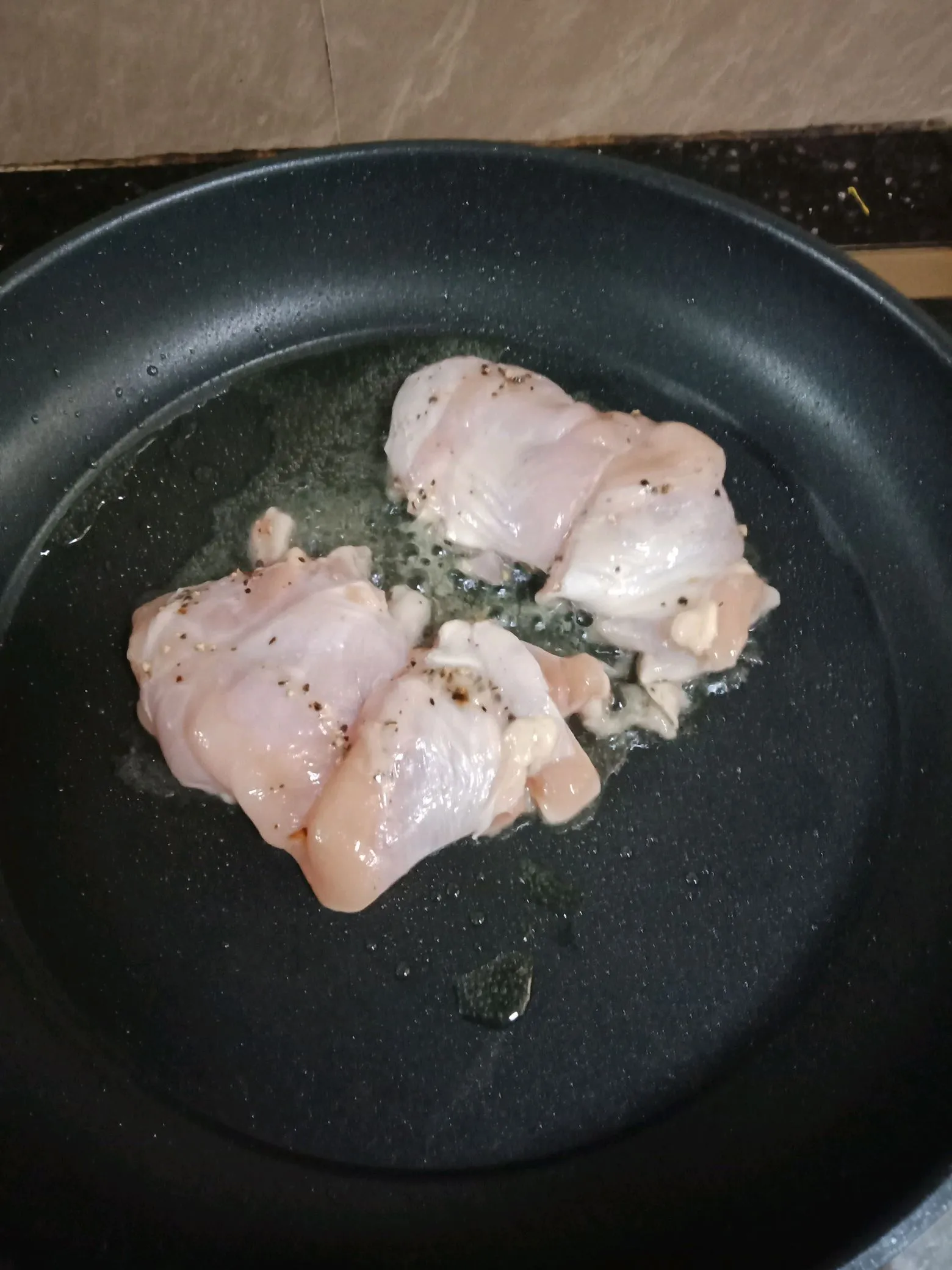 Bước 3: Đổ một ít dầu ăn vào chảo đun nóng, cho thịt gà đã ướp vào chiên chín vàng đều hai mặt là được. Thịt gà chín thì thái miếng vừa ăn.