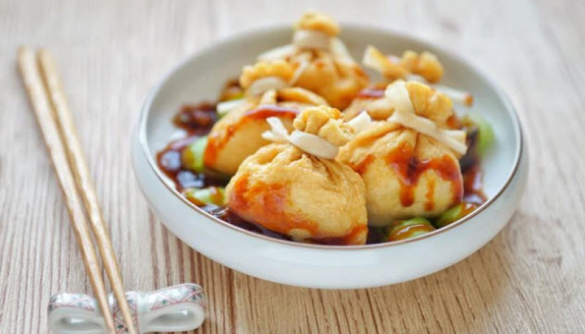 Bước 7: Xếp cả túi may mắn ra đĩa, rưới nước sốt lên là chiếc túi may mắn đậu phụ thơm ngon, đẹp mắt đã hoàn thành.