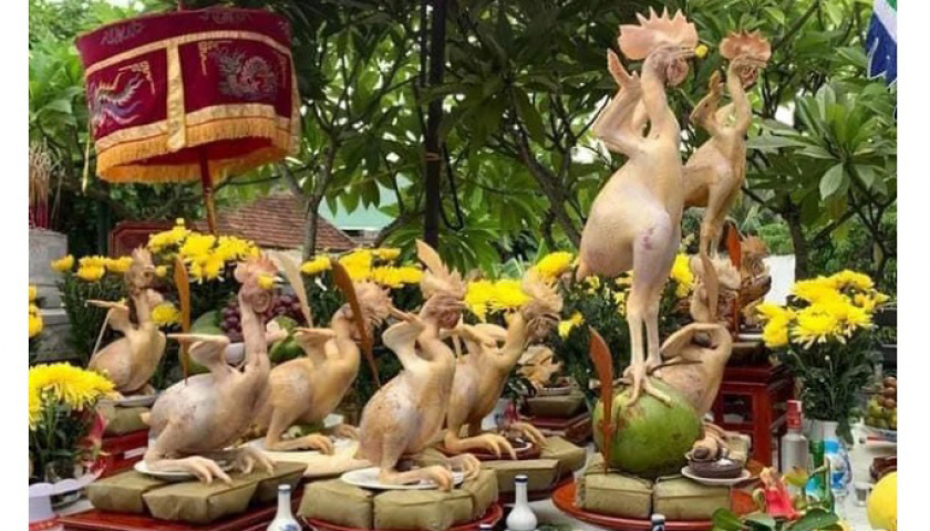 Nhiều năm qua, những mâm cỗ có gà tạo thế dâng cúng tổ tiên vào dịp Rằm tháng giêng đã trở thành thông lệ đối với nhiều gia đình, dòng họ tại huyện Lộc Hà (Hà Tĩnh). Những chú gà bay uy nghi với cặp giò thẳng đứng, đôi cánh vươn lên khiến nhiều người xem trầm trồ và thán phục trước sự khéo léo của người dân.