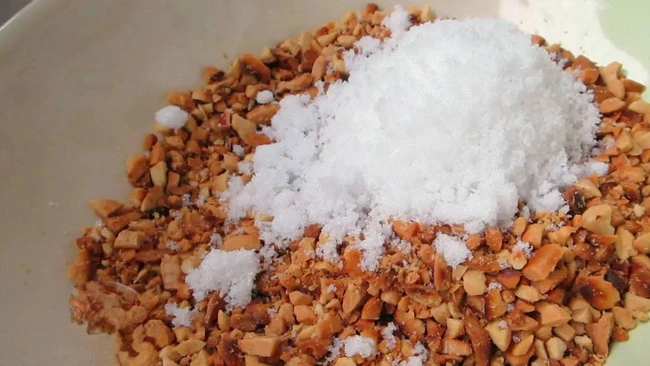 Bước 2: Đặt chảo lên bếp, chờ nóng thì cho lạc vào rang đến khi chín. Chờ cho lạc nguội thì xoa bỏ lớp lụa rồi dùng cối giã nát (hoặc bạn cũng có thể cho vào túi và dùng cây lăn nghiền nát) rồi cho ra tô. Tiếp theo bạn cho 30g đường trắng vào tô lạc, trộn đều. Lưu ý, tùy vào khẩu vị, bạn có thể tăng giảm lượng đường theo sở thích của mình nhé!