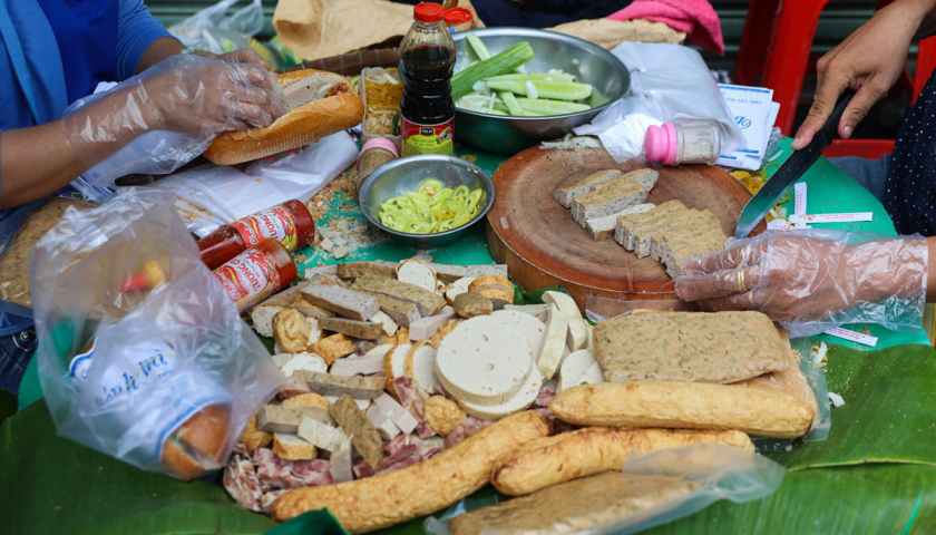 Bánh mì là món ăn đường phố đầu tiên của Việt Nam được nhắc đến trong 11 món lọt top 100, đạt 4,5 trên 5 sao. Món ăn gây ấn tượng nhờ vỏ ngoài giòn, nhân thịt được tẩm ướp vừa miệng và có nhiều gia vị đi kèm. Người Việt Nam thường ăn bánh mì cùng rau thơm và dưa muối chua ngọt. Một số phiên bản bánh mì kẹp được Taste Atlas gợi ý cho du khách là bánh mì xíu mại, bánh mì heo quay, bánh mì chả cá. Ảnh: Quỳnh Trần
