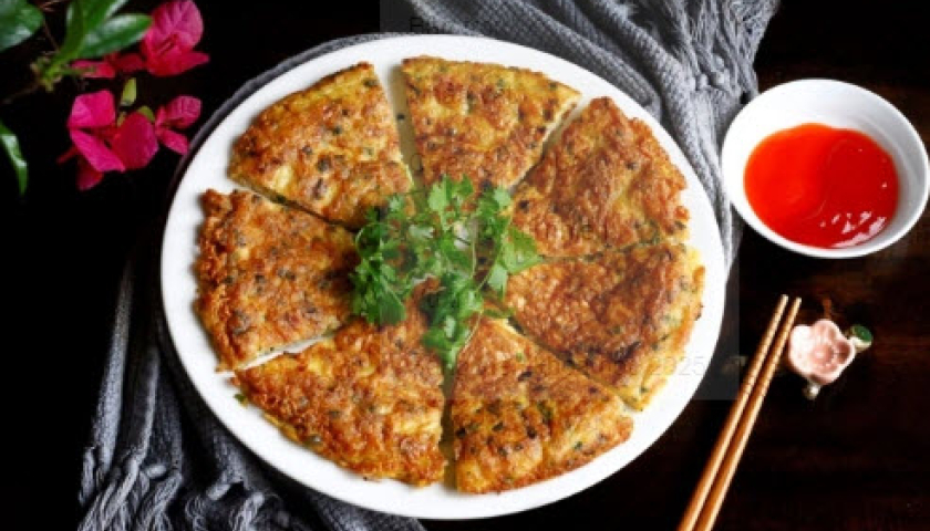 - Lật trở rán mặt còn lại: Dùng một cái đĩa to úp chảo rồi nhẹ nhàng đẩy xuống để rán mặt còn lại. khi trứng bên dưới rìa giòn, vàng thơm, bông xốp là được. Lấy trứng ra cắt miếng vừa ăn rồi thưởng thức nóng.