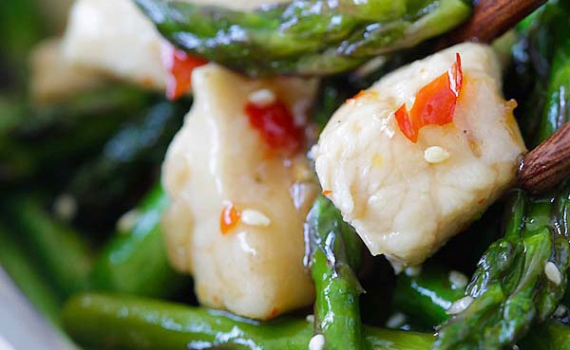 Thịt gà xào măng tây sốt cay ngọt