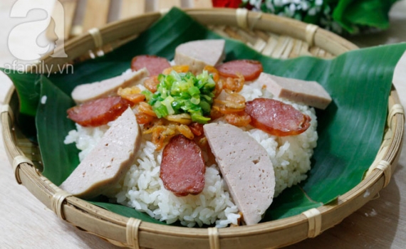 Xới xôi ra đĩa sau đó xếp lạp xưởng, giò lụa thái miếng vừa ăn lên xôi, sau cùng cho tôm nõn và rưới mỡ hành lên trên để thưởng thức.