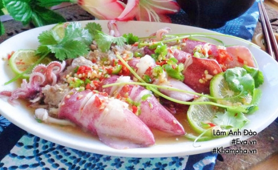 Cho dĩa mực ra bàn, chan hết chén nước mắm chanh vào. Món này ăn với cơm hay ăn chơi đều ngon và thanh vị.