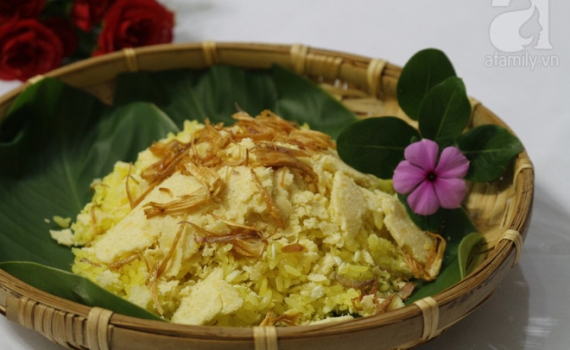Xới xôi ra đĩa sau đó dùng dao gọt đậu xanh lên trên xôi, rắc thêm hành phi và rưới 1 chút mỡ lợn để món xôi được béo ngậy và thơm ngon hơn.