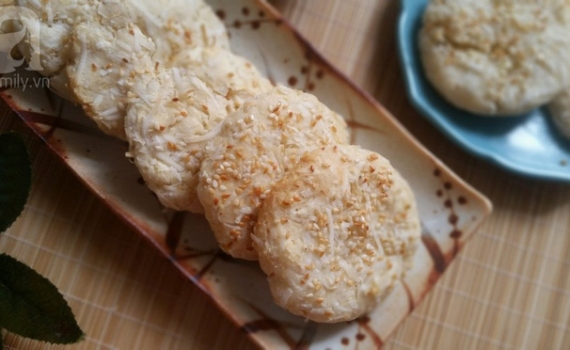 Bước 5: Viên sắn thành những viên tròn rồi ấn dẹt, rắc vừng trắng lên trên. Đặt vào khay nướng có lót giấy nến rồi cho vào lò nướng khoảng 25 đến 30 phút ở nhiệt độ 180 độ.