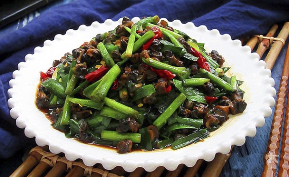 Thêm hẹ vào và đảo đều thật nhanh trên lửa lớn rồi tắt bếp.