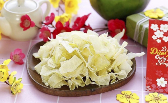 Từng sợi đu đủ nạo dài, mỏng nhẹ tươi ngon, bọc một lớp đường cô xung quanh, ngọt dịu. Hương vị thơm thơm bùi bùi rất hấp dẫn.