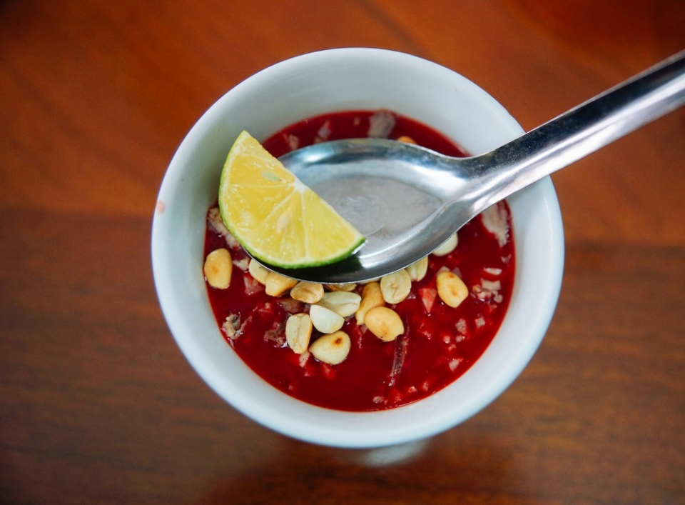 Người Việt ăn tiết canh thường vắt thêm chanh tươi và dùng kèm rau thơm. Các nguyên liệu nhỏ kết hợp lại đem đến vị thơm, bùi và ngậy.