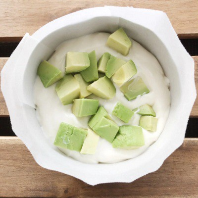 Bơ mua về rửa sạch, gọt vỏ và loại bỏ hạt. Dùng dao cắt bơ thành những miếng nhỏ. Làm tương tự với những loại trái cây khác nếu bạn không tìm mua được bơ. Nhẹ nhàng xếp đều bơ lên trên hỗn hợp kem phô mai.
