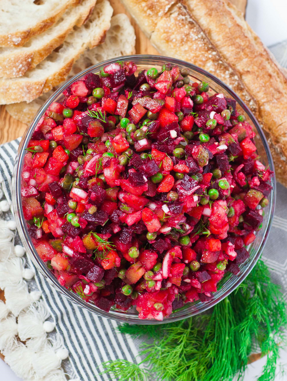 Vinaigrette: Theo nguyên bản, món ăn này là hỗn hợp của các loại rau củ như khoai tây luộc, củ cải đường, cà rốt và đậu. Ngoài ra, người đứng bếp có thể cho thêm hành tây, ngò hoặc dưa chuột. Hỗn hợp rau củ đem trộn với dầu thay vì các loại sốt như nhiều món khác. Đây là món ăn cung cấp các loại vitamin và khoáng chất hữu ích.
