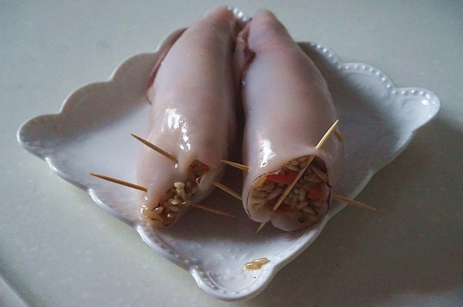 Nhồi gạo nếp đã xào vào mực, dùng tăm để cố định một đầu. Cho mực nhồi vào nồi hấp sôi khoảng 30-35 phút là mực chín.