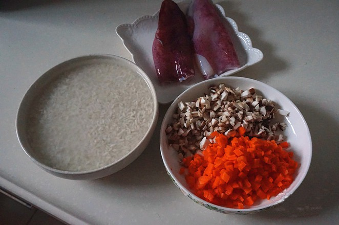 Gạo nếp vo sạch, ngâm trong nước khoảng 3 giờ. Nấm hương và cà rốt rửa sạch thái nhỏ. Mực rửa sạch, loại bỏ màng đen bên ngoài.