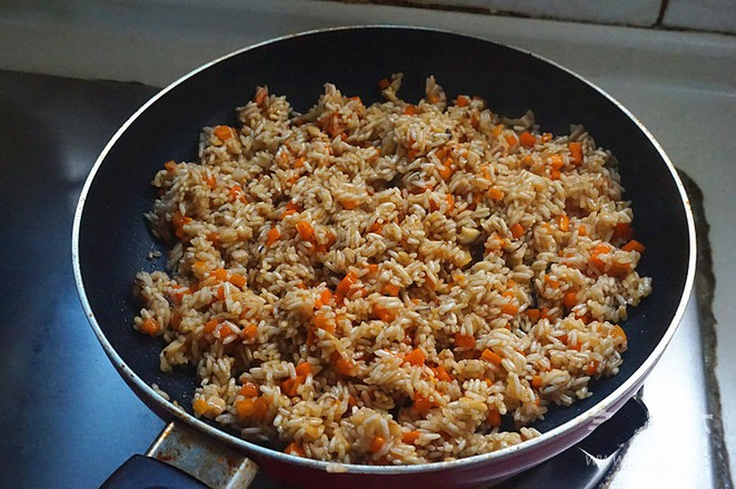 Thêm gạo ngâm vào xào chung, thêm muối và nước tương vào đảo đều.