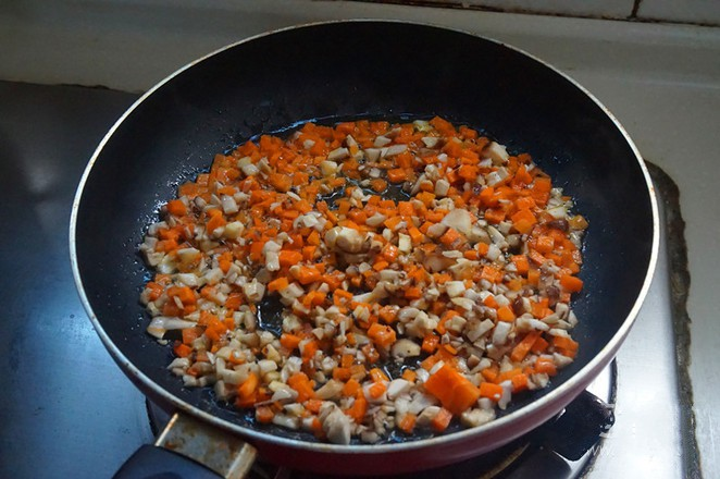 Đun nóng dầu ăn trong chảo, cho cà rốt và nấm hương vào xào thơm.