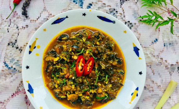 Lá chanh thái sợi nhuyễn cho vào, đảo nhanh qua rồi tắt bếp.