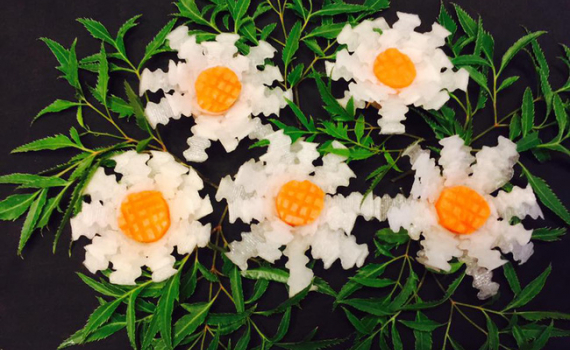 Cúc họa mi là loài hoa trắng tinh khôi, mộc mạc được người Hà Thành rất yêu thích. Bạn hãy tỉa những bông cúc họa mi từ củ cải trắng để trang trí trên bàn ăn nhé!