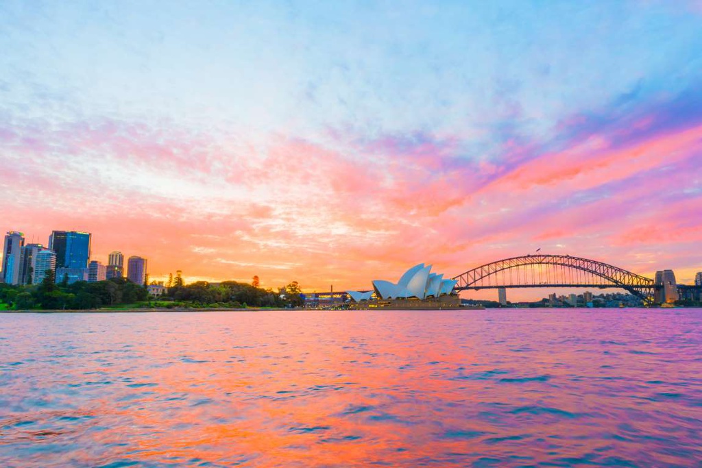 Sydney (Australia): Opera Syney hay "nhà hát con sò" trở nên nổi bật dưới ánh hoàng hôn. Các công trình kiến trúc hiện đại phản chiếu xuống mặt nước nhuốm màu cam, tím, tạo nên khoảnh khắc cuối ngày ấn tượng.