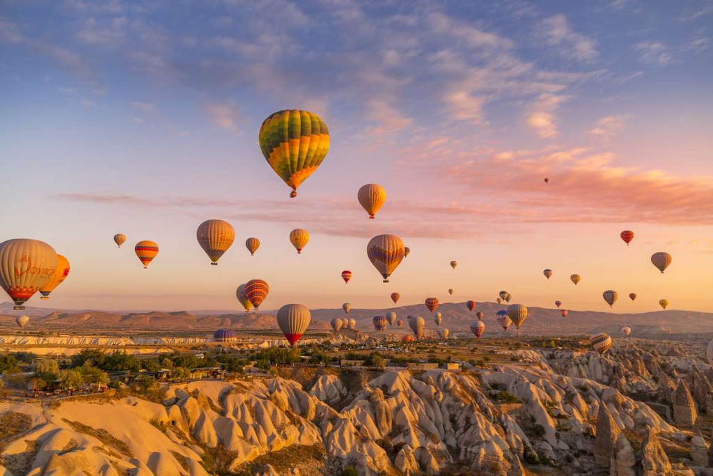 Cappadocia (Thổ Nhĩ Kỳ): Cappadocia ở miền Trung Thổ Nhĩ Kỳ được biết đến với phong cảnh đẹp như cổ tích, các hang động, đền thờ mang vẻ thần bí và những tảng đá tráng lệ. Khi hoàng hôn buông, bầu trời đầy màu sắc được chấm phá bởi hàng nghìn khinh khí cầu.
