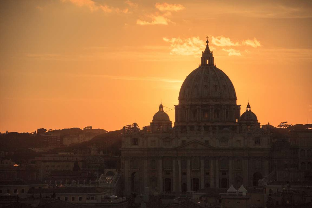 Rome, Italy: Khung cảnh buổi chiều tà yên bình được ghi lại ở nhà thờ St. Peter, bên bờ sông Tiber. Trên nền trời cam đào, kiến trúc cổ điển, độc đáo của nhà thờ càng hiện lên rõ nét.