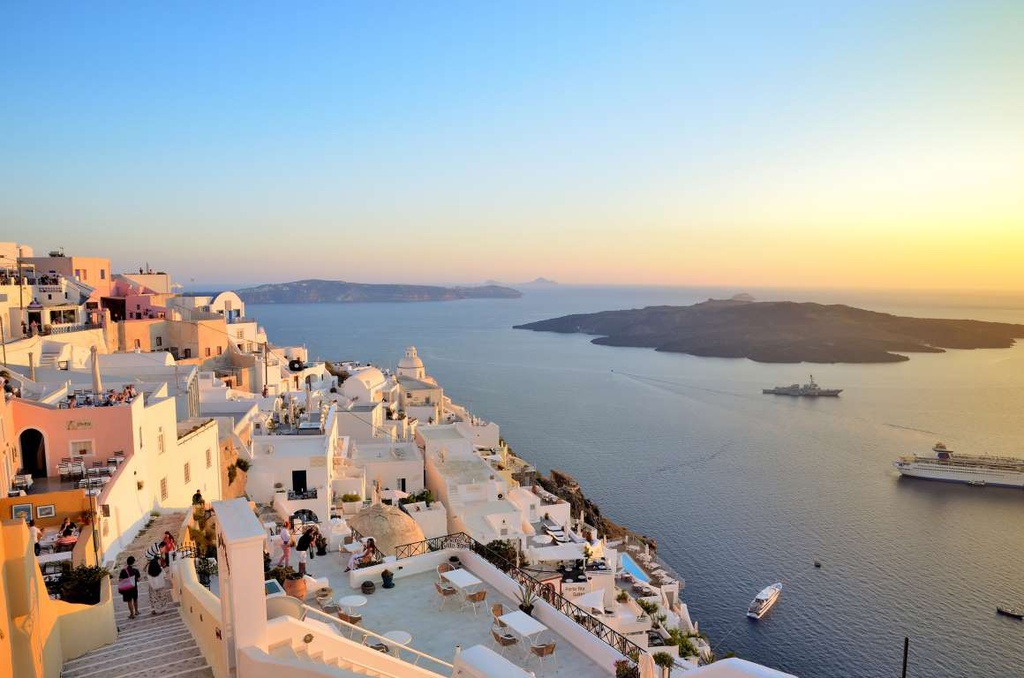 Santorini (Hy Lạp): Những ngôi nhà tone trắng, xanh trở nên ấm áp hơn dưới thời khắc hoàng hôn. Bờ biển Aegean được nhuộm màu rực rỡ, là điểm ngắm mặt trời lặn tuyệt đẹp ở Hy Lạp.