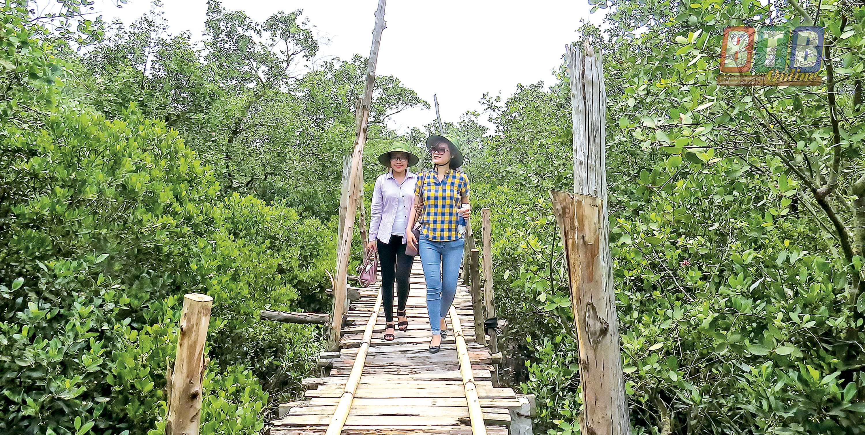 Du khách thích thú khi được trải nghiệm cầu tre xuyên rừng ngập mặn tại cồn Đen.