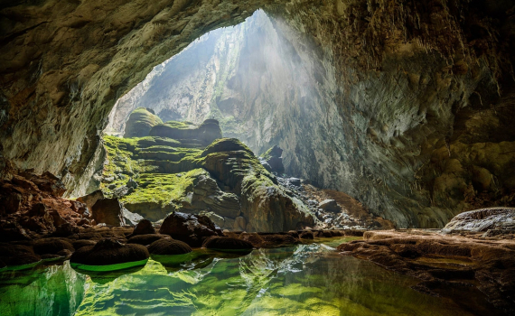 Nằm trong Vườn quốc gia Phong Nha - Kẻ Bàng, tỉnh Quảng Bình, Sơn Đoòng với độ dài 9 km là hang động rộng lớn nhất thế giới. Hang mới được con người phát hiện vào năm 2009, có kích thước chiều rộng 150 m và cao hơn 200m đủ để hình thành một hệ thời tiết độc lập với thế giới bên ngoài. Hang có cả rừng rậm, sông ngầm, mây sương bao phủ riêng và đặc biệt cảnh quan tự nhiên không bị con người tác động tới. Ảnh: Ryan Deboodt.
